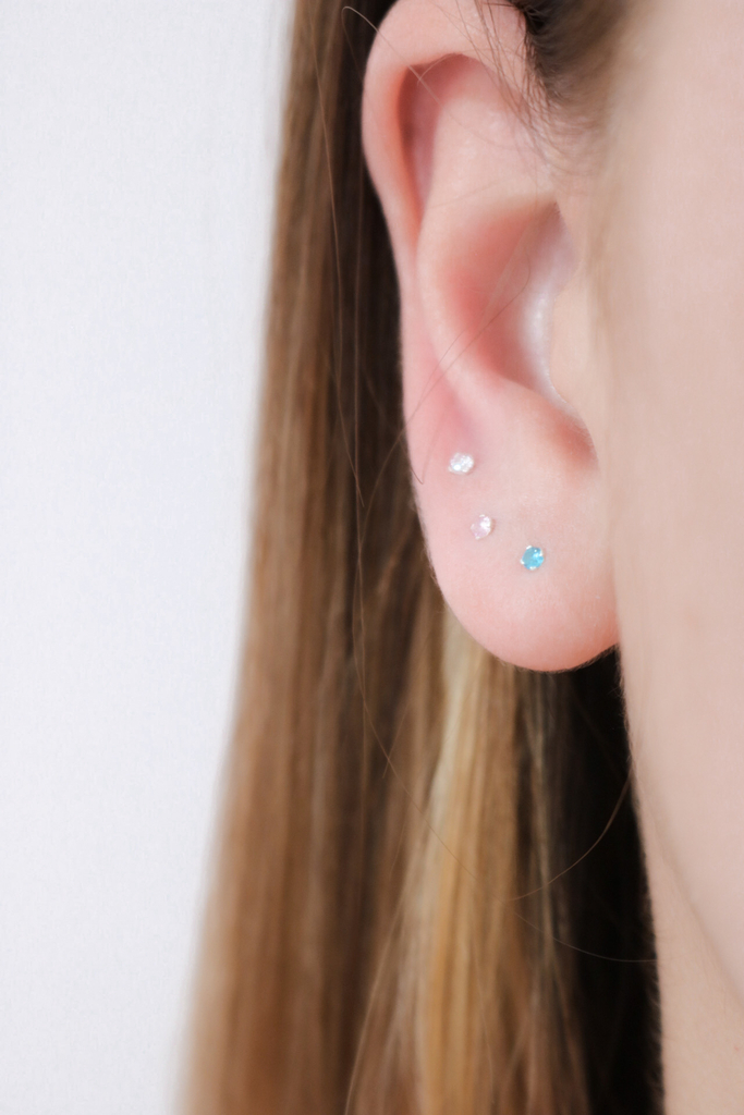 Brinco simples com pedras coloridas. Pedras cristal, rosa e azul em cores claras.